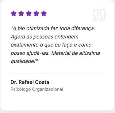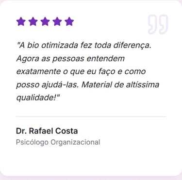 Ela é gerada após uma análise detalhada do seu perfil e voltada para o tipo de resultado que você deseja alcançar: seja atrair mais pacientes, aumentar sua autoridade ou poder cobrar um valor melhor por suas sessões.